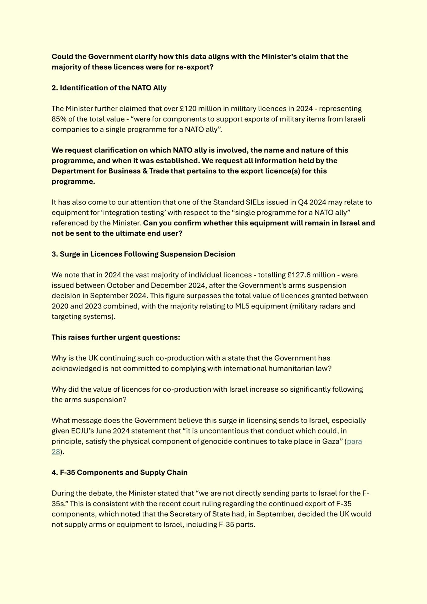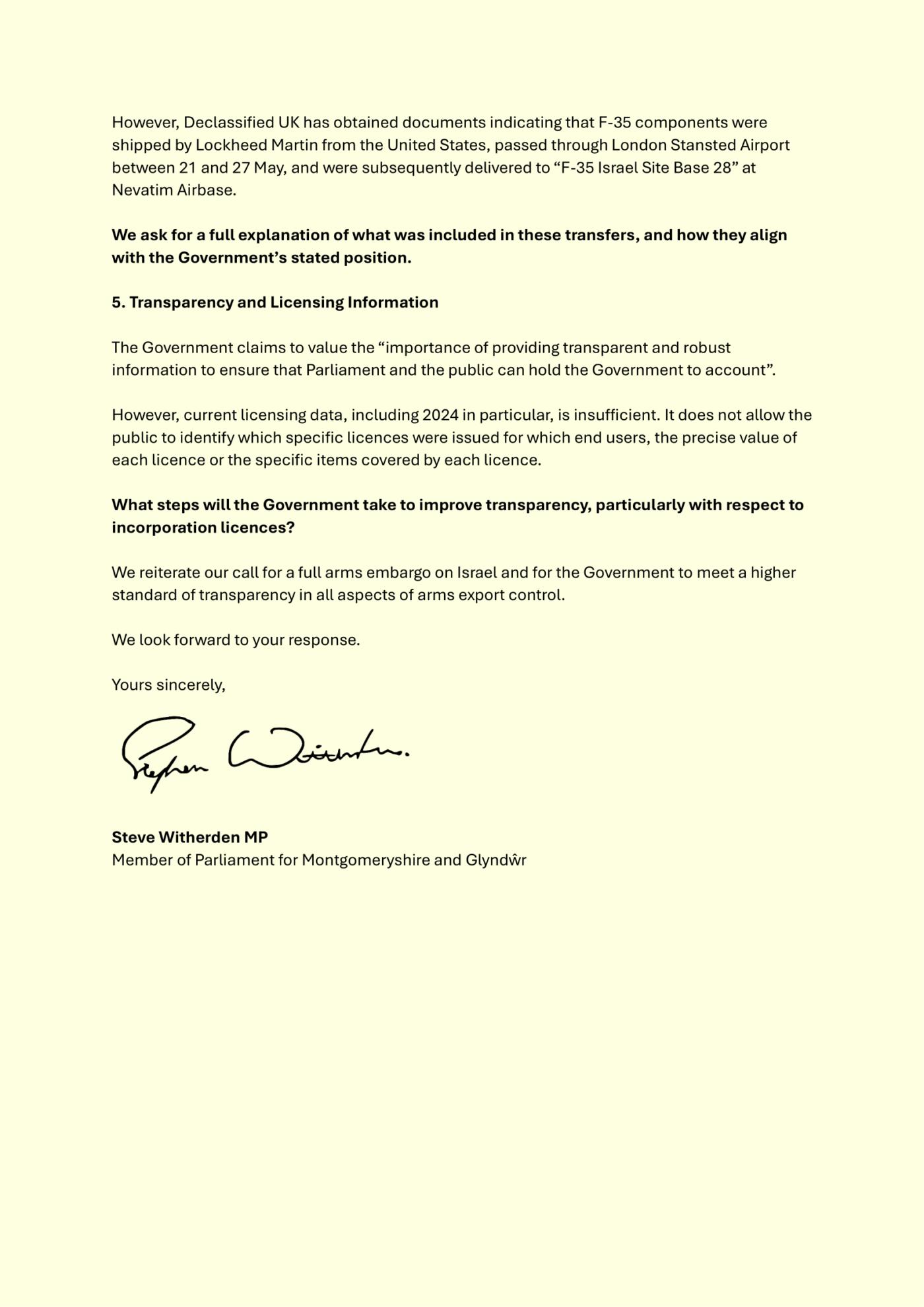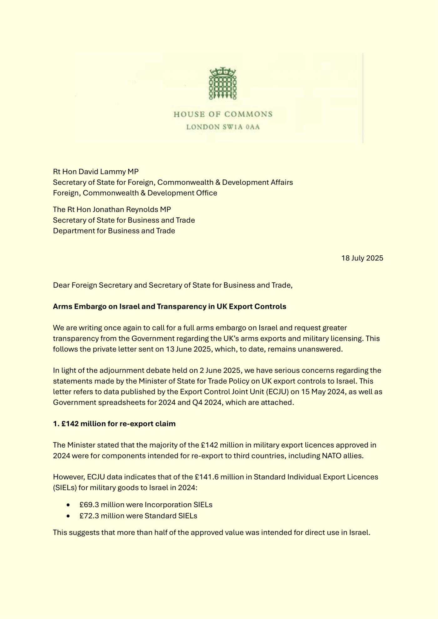 I have written a public letter to the Foreign Secretary and the Business Secretary, with the support of the Campaign Against Arms Trade, calling for an embargo on arms to Israel and greater transparency in UK arms exports. 57 MPs and Lords have signed it.